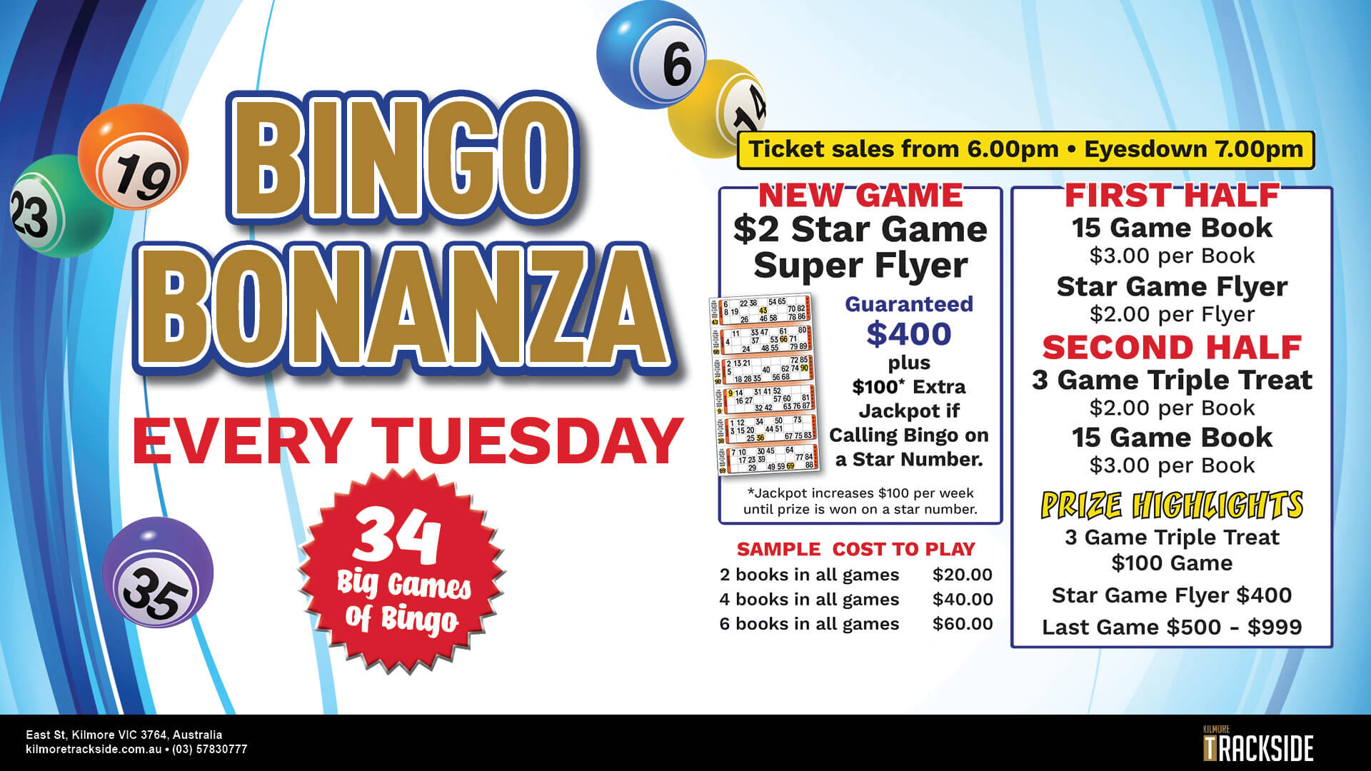 What’s On Loading view. Events Search and Views Navigation Search Enter Keyword. Search for Events by Keyword. Find Events Event Views Navigation Photo List Summary Photo Today Upcoming Upcoming Select date. Weekly on Tuesdays Tuesday Night Bingo Bonanza LEARN MORE Monthly RACING CALENDAR RACE MEETINGS Every Friday Friday Night Raffles LEARN MORE November 2 @ 6:00 pm Melbourne Cup Calcutta LEARN MORE November 6 @ 12:00 pm Oaks Day LEARN MORE Sunday, 23rd November The bet365 Kilmore Cup LEARN MORE Previous Events Today Next Events Subscribe to calendar Google Calendar iCalendar Outlook 365 Outlook Live Export .ics file Export Outlook .ics file